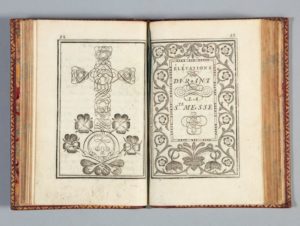 DUVAL (Nicolas). Nouvelles heures gravées au burin. Dédiées au Roy. Se vendent à Paris, chez J. Mariette, s.d. [vers 1700]. In-12, maroquin rouge, filet pointillé en encadrement avec petit fleuron aux angles, dos orné, roulette intérieure, tranches dorées sur marbrure (Reliure de l'époque). Charmant livre d'heures entièrement gravé en taille-douce par Nicolas Duval, maître écrivain, calligraphe et graveur français. Il se remarque par ses nombreux ornements (bandeaux, culs-de-lampe, fleurons, lettres ornées et historiées, etc.) et possède plusieurs pages de titre intermédiaire. Très plaisant exemplaire en maroquin rouge de l'époque. Note manuscrite du XXe siècle sur une garde.