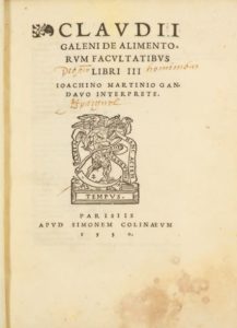 GALIEN. De alimentorum facultatibus libri III. Paris, Simon de Colines, 1530. In-4, demi-maroquin cerise, dos lisse orné, tranches jaunes (Reliure moderne). Renouard, Colines, p. 155. — Vicaire, col. 380. Première édition de la traduction latine, due à Joachim Martin, médecin gantois qui faisait partie de l'entourage humaniste d'Érasme. Le De alimentorum facultatibus est l'un des premiers traités de médecine entièrement consacrés à la nourriture : Galien y parle du pain, des légumes, des fruits et des autres produits végétaux, de la viande et du poisson, du lait, du fromage, du miel ou encore du vin. Annotations manuscrites de l'époque dans les marges de quelques feuillets. Devise manuscrite ancienne sur le titre : Deo non hominibus signée Espaignol. Exemplaire en reliure moderne, le dos décoré dans le goût du XVIIIe siècle. Trace de mouillure dans la partie inférieure du volume avec taches couleur lie-de-vin aux 40 premiers feuillets.