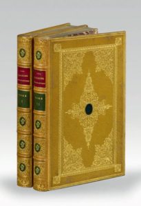 LACLOS (Choderlos de). Les Liaisons dangereuses. Lettres recueillies dans une société, et publiées pour l'instruction de quelques autres. Londres, 1796 [vers 1812]. 2 volumes in-8, maroquin citron, double encadrement de trois filets dorés, roulette, écoinçons en forme de gerbe, cartouche central doré aux petits fers avec au milieu un médaillon ovale de maroquin noir, dos orné, caissons décorés aux petits fers avec petit médaillon ovale mosaïqué chargé d'une fleurette dorée, pièces de titre rouge et de tomaison verte, dentelle intérieure, tranches dorées sur marbrure (Reliure vers 1870). Contrefaçon de l'édition de Londres de 1796, ornée de 2 frontispices et 13 figures de Monnet, Mlle Gérard et Fragonard fils. Dans cette réimpression l'illustration est la même mais les planches ont été retouchées par Delvaux. Belle reliure au décor inspiré du XVIIe siècle. Des bibliothèques Elzéar Pin (1884, n°263) et baron de Bellet (ex-libris armorié). Des piqûres, déchirure sans manque réparée à une planche au tome I. Petites tavelures sur les plats.