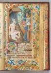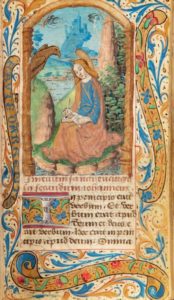 MANUSCRIT - Livre d'heures (à l'usage de Paris) En latin et en français, manuscrit enluminé sur parchemin France, Paris, vers 1480-1490 Avec 6 grandes miniatures et 2 petites miniatures attribuables au Maître du Romuléon de Cluny, actif à Paris à la fin des années 1480 jusqu'en 1500 100 ff. [feuillets de gardes de parchemin compris dans la foliotation], manque deux feuillets entre les ff. 14-15 (début des Heures de la Vierge avec très certainement une miniature introduisant matines [Annonciation]) et ff. 51-52 (début des Heures de la Croix avec très certainement une miniature [Crucifixion]) (collation : i4, ii8, iii7 (8-1, manque i), iv8, v8, vi8, vii6, viii7 (8-1, manque i), ix8, x8, xi8, xii8, xiii8), foliotation moderne à l'encre rouge, écriture bâtarde à l'encre brune, avec 26 lignes par feuillet, feuillets réglés à l'encre rouge pâle (justification : 100 x 54 mm), quelques réclames (ff. 21v, 29v, 37v, 45v, 58v, 74v, 82v, 90v), calendrier avec deux mois par page, rubriques en rouge pâle (tirant sur le rose), nombreuses initiales à l'or liquide sur fonds rouge foncé et brun/marron (1 à 2 lignes de hauteur), bout-de-lignes de bois écotés dorés en alternance avec bout-de-lignes ornés avec motifs de feuillages à l'or liquide sur fond rouge foncé, quelques bordures avec phylactères ou ceinturons comportant une devise « Faute d'argent », plus grandes initiales peintes en gris clair avec rehauts blancs sur fonds rouge foncé orné de motifs floraux sur fonds d'or liquide. Reliure de maroquin rouge, dos à 4 nerfs cloisonné avec chiffré « PP » couronné répété dans les entre-nerfs, décor à la Duseuil sur les plats avec aux angles extérieurs du cadre central quatre chiffres « PP » couronnés, au centre des plats un écu orné de petits fers contenant le même chiffre « PP » couronné, roulette sur les coupes, tranches dorées, papier marbré sur les contreplats seuls (reliure XVIIe siècle). Quelques frottements à la reliure (sans gravité), coins un peu émoussés, quelques épidermures, mors un peu fendus, mais généralement en bel état de conservation. Feuillets rognés un peu court en hauteur. Dimensions de la reliure : 142 x 92 mm ; dimensions des feuillets : 136 x 85 mm. Bon état général (malgré le déficit de deux feuillets). Quelques feuillets rognés court, notamment sur les bords extérieurs du calendrier et haut des feuillets avec miniatures. Ce manuscrit est peint à Paris et contient des miniatures attribuables au Maître du Romuléon du Musée de Cluny d'après le manuscrit d'un Romuléon par Sébastien Mamerot dans la traduction de Jean Miélot, aujourd'hui conservé à l'état de fragments. Le Musée de Cluny conserve la seule miniature à pleine page de ce Maître, et une plus petite, d'où la proposition de François Avril de nommer cet artiste « Maître du Romuléon du Musée de Cluny » (Musée de Cluny, Inv. 804 et 1819). L'essentiel de l'activité de cet artiste peut être situé à Paris. On retrouve sa main dans le fort beau livre d'heures, également à l'usage de Rome (Heures dites Rochereau-Le Goix), conservé à Chaumont, BM, MS 34 (voir Delaunay, 2000, vol. 2, pp. 55-60), avec lequel il partage certaines mise-en-pages, notamment le calendrier et la séparation entre deux colonnes au moyen d'un décor de pierreries (voir dans les Heures « Bezombes » ff. 3v-6). On retrouve la main de l'artiste dans plusieurs Heures à l'usage de Paris (Paris, BnF, lat. 1423 (on signalera la proximité des bordures avec les Heures « Bezombes ») et lat. 13296). Citons aussi des Heures à l'usage de Langres conservées à New York, PML, M 26. Le Maître du Romuléon de Cluny a également beaucoup œuvré à l'illustration d'incunables, par exemple la célèbre Mer des Histoires de Pierre Le Rouge, vers 1488-1489. L'artiste propose des compositions qui trahissent sa bonne connaissance des estampes parisiennes. Grâce à cette activité, on peut le suivre à Paris jusque vers 1495. L'artiste affectionne le traitement des yeux mi-clos, les sourcils froncés. La miniature représentant Saint Jean sur l'île de Patmos présente les mêmes éléments caractéristiques que dans la miniature conservée à Chaumont (MS 34) avec des paysages aux rochers fantastiques, des collines bleutées, les arbustes et l'utilisation d'un vert presque olive (sur le Maître du Romuléon de Cluny, on consultera I. Delaunay, Echanges artistiques entre les livres d'heures manuscrits et imprimés produits à Paris vers 1480-1500, thèse de doctorat Paris IV, Paris, 2000). TEXTE ff. 1-3, feuillets blancs - ff. 3v-6, Calendrier, en français, universel pour Paris, avec deux mois par page - f. 6v, feuillet blanc - ff. 7-10v, Péricopes évangéliques - ff. 11-13v, Obsecro te - ff. 14-17v, Sept vers de Saint Grégoire (introduit par une longue rubrique en français (fol. 13v) (manque la fin) - ff. 18-51, Heures de la Vierge, à l'usage de Paris, avec matines (ff. 18-28) ; laudes (ff. 28v-34v) ; prime (ff. 35-38), avec antienne, Benedicta tu et capitule, Felix namque ; tierce (ff. 38-40) ; sexte (ff. 40-42) ; none (ff. 42v-44),