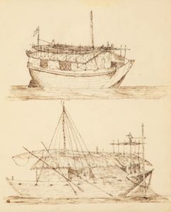 MANUSCRIT. — Carnet illustré d'un voyage en Inde. S.l.n.d. [années 1830]. Manuscrit in-4 (230 x 185 mm) de 28 pages, demi-basane maroquinée vert foncé avec coins (Reliure de l'époque). Carnet manuscrit illustré d'un voyageur anglais parti dans les années 1830 en Inde au départ de Londres. Il contient des commentaires et des observations sur la navigation, consignés au cours du voyage, avec des références aux escales, aux lieux de la côte aperçus et aux navires croisés (les rochers d'Eddystone, l'île de Madère, le Cap de Bonne-Espérance, etc.). 20 planches de dessins à l'encre et au crayon représentent divers types d'embarcations indigènes, des paysages, des ébauches animalières. Frottements à la reliure.