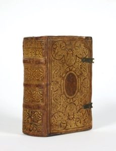 RELIURE. — MAROT (Clément) et Théodore de BÈZE. Les Pseaumes de David, mis en rime françoise, et en Alemande par Ambrosius Lobwasser. S.l. [Genève], Jacob Stoer, 1598. Fort volume in-16, veau fauve, double filet doré, plaque à décor d'entrelacs et grotesques se déployant autour d'un médaillon central en réserve, restes de fermoirs, dos orné, tranches dorées (Reliure de l'époque). Très rare édition bilingue, en latin et en allemand : sur les 8 exemplaires répertoriés à ce jour dans les fonds publics par la base en ligne GLN, aucun ne se trouve en France (GLN-1087). Titre placé dans un bel encadrement gravé sur bois, comportant la marque de Stoer en bas. Jolie reliure ornée d'une plaque à décor d'entrelacs et grotesques, très certainement locale et strictement contemporaine de l'édition qu'elle recouvre. Incomplet de 2 feuillets (M7, et un feuillet du dernier cahier Kkk qui est vraisemblablement le dernier feuillet). Petit manque de papier en bas du feuillet Q2 avec perte de la réclame. Quelques rousseurs et taches à certains feuillets. Restaurations à la reliure (coins, coiffes et mors), un mors fendu.