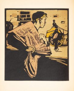 NICHOLSON (William). London Types. Quatorzains by W. E. Henley. Londres, William Heinemann, 1898. In-4, cartonnage demi-toile beige, premier plat illustré (Reliure de l'éditeur). 13 grands bois de William Nicholson gravés en couleurs en deux ou trois tons, dont un sur le premier plat. Un des plus beaux livres de l'artiste. Quelques piqûres sur le premier plat et petite usure aux coins.