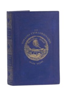 Cinq semaines en ballon / Voyage au centre de la Terre par Jules Verne. Illustrations de Riou et Montaut puis Riou seul. Paris, Bibliothèque d'Éducation et de Récréation, J. Hetzel Éditeur, 1867. Grand in-8° double. Cartonnage éditeur personnalisé en pleine percaline bleu saphir portant les mentions «Les Voyages Extraordinaires / Deuxième série / Jules Verne» en couverture. Charles Magnier relieur. Tranches dorées. Gardes peigne. Imprimerie Jules Bonaventure. Deuxième édition illustrée et augmentée de 26 nouvelles gravures légendées pour Cinq semaines en ballon (1867) et édition originale illustrée pour Voyage au centre de la Terre (1867). Premier cartonnage collectif sans le frontispice général. Coiffes si habilement consolidées que le travail est invisible. Sinon, superbe exemplaire, particulièrement rare dans cette condition et surtout dans cette teinte !