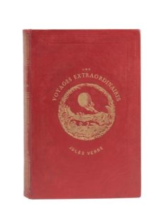 Cinq semaines en ballon / Voyage au centre de la Terre par Jules Verne. Illustrations de Riou et Montaut puis Riou seul. Paris, Bibliothèque d'Éducation et de Récréation, J. Hetzel Éditeur, 1867 (1868 pour le cartonnage). Grand in-8° double. Cartonnage personnalisé de l'éditeur en pleine percaline rouge vermillon portant les mentions «Les Voyages Extraordinaires / Jules Verne» au premier plat. Lenègre Relieur. Tranches dorées. Gardes veloutées bleu. Imprimerie Jules Bonaventure. Deuxième édition illustrée et augmentée de 26 nouvelles gravures légendées pour Cinq semaines en ballon et édition originale illustrée pour Voyage au centre de la Terre. Deuxième cartonnage collectif sans le frontispice général. Coiffes très habilement restaurées. Sinon, bel et très plaisant exemplaire de ce second cartonnage reprenant les premiers tirages grands in-8° pour les deux titres. Paradoxalement, très rare en rouge !