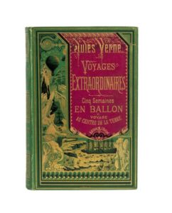 Cinq semaines en ballon / Voyage au centre de la Terre par Jules Verne. Illustrations de Riou et Montaut puis Riou seul. Paris, Bibliothèque d'Éducation et de Récréation, J. Hetzel Éditeur, sd (1875). Grand in-8° double. Cartonnage éditeur bicolore «à la bannière» rouge-violet sur fond vert prairie portant la mention «Edition» au 1er plat et avec un second plat Lenègre de type «b». Tranches dorées. Gardes bleu. Catalogue sans mention pour 1875-1876. Imprimerie Gauthier-Villars. Superbe exemplaire dans une très belle alliance de couleurs. Une vraie merveille ! Rarissime dans cette condition !