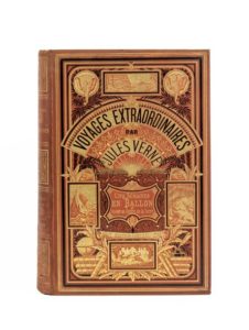 Cinq semaines en ballon / Voyage au centre de la Terre par Jules Verne. Illustrations de Riou et Montaut puis Riou seul. Paris, Bibliothèque d'Éducation et de Récréation, J. Hetzel Éditeur, sd (1879). Grand in-8° double. Cartonnage éditeur en pleine percaline marron fauve «aux deux éléphants» du 1er type Lenègre. Lenègre relieur. Tranches dorées. Gardes bleu. Catalogue «AB» pour 1879-1880. Imprimerie Gauthier-Villars. Discrètes décolorations en tête du second plat et sur le dos. Sinon très agréable exemplaire. Un titre moins fréquent qu'il n'y parait dans ce cartonnage, surtout dans cette teinte !