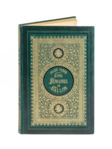Cinq semaines en ballon par Jules Verne. Illustrations de Riou et Montaut. Paris, Bibliothèque d'Éducation et de Récréation, J. Hetzel Éditeur, sd (1874). Grand in-8° simple. Cartonnage éditeur en pleine percaline vert épinard et «aux bouquets de roses» du 5e type. Charles Magnier relieur. Tranches dorées. Gardes bleu. Imprimerie Gauthier-Villars. Rousseurs parfois appuyées. Un feuillet légèrement déréglé. Sinon, cartonnage superbe !