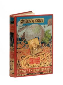 Cinq semaines en ballon /Voyage au centre de la Terre par Jules Verne. Illustrations de Riou et Montaut puis Riou seul. Paris, Bibliothèque d'Éducation et de Récréation, J. Hetzel Éditeur, sd (ca 1892). Grand in-8° double. Cartonnage éditeur polychrome «au portrait collé». Lenègre Relieur. Tranches dorées. Gardes bleu. Huit planches hors-texte en couleurs. Catalogue «HF» pour 1894-1895. Imprimerie Gauthier-Villars. Très bel exemplaire.