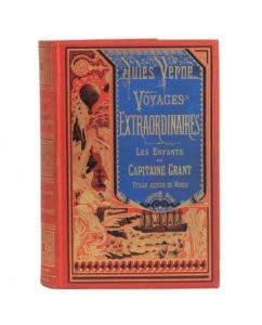 Les Enfants du capitaine Grant par Jules Verne. Illustrations de Riou. Paris, Bibliothèque d'Éducation et de Récréation, J. Hetzel et Cie, sd (ca 1884). Grand in-8° triple. Cartonnage éditeur bicolore biseauté «à la bannière» bleu sur fond rouge. A Lenègre relieur. Tranches dorées. Gardes bleu. Catalogue «CH» pour 1884-1885. Imprimerie Gauthier-Villars. Très bel exemplaire.