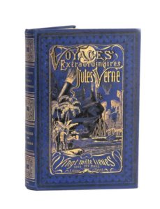 Vingt mille lieues sous les mers par Jules Verne. Illustrations par de Neuville et Riou. Bibliothèque d'Éducation et de Récréation, J. Hetzel et Cie, Paris, sd (ca 1872). Grand in-8° double. Cartonnage éditeur en pleine percaline bleu cobalt «à l'obus» avec 2e plat Lenègre de type «b». Tranches dorées. Gardes bleu. Imprimerie Gauthier-Villars. Coiffes parfaitement restaurées. Rousseurs. Sinon, voici un bel exemplaire dans la teinte idéale pour ce titre !