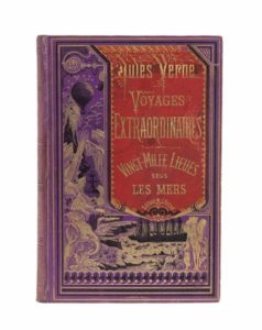 Vingt mille lieues sous les mers par Jules Verne. Illustrations par de Neuville et Riou. Bibliothèque d'Éducation et de Récréation, J. Hetzel et Cie, Paris, sd (ca 1876). Grand in-8° double. Cartonnage éditeur bicolore «à la bannière» rouge vermillon sur fond violet d'évêque portant la mention «Edition» avec un 2e plat Lenègre de type «b». Lenègre Relieur. Tranches dorées. Gardes bleu. Catalogue sans mention pour 1875-1876. Imprimerie Gauthier-Villars. Coiffe supérieure restaurée. Dos passé avec les ors éteints. Quelques rousseurs. Cet exemplaire n'en est pas moins remarquable de par sa très rare et magnifique alliance de couleurs. Les amateurs de «bannières» ne s'y tromperont pas.