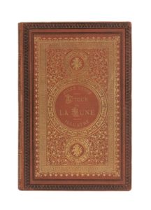 Autour de la Lune par Jules Verne. Ill. par d'Émile Bayard et A. de Neuville. Paris, J. Hetzel et Cie, sd (1873). Grand in-8° simple. Cartonnage éditeur en pleine percaline brun fauve «aux bouquets de roses» du 4e type. Tranches dorées. Gardes bleu-gris. Charles Magnier Relieur. Imprimerie Gauthier-Villars. Quelques rares rousseurs. Mouillure très discrète en tête de 4e et 5e cahiers. Sinon, bel exemplaire dans une teinte peu commune.