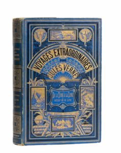 De la Terre à la Lune et Autour de la Lune par Jules Verne. Illustrations par de Montaut (De la Terre à la Lune) et Émile Bayard et A. de Neuville (Autour de la Lune). Paris, Bibliothèque d'Éducation et de Récréation, J. Hetzel et Cie, sd (ca 1879). Grand in-8° double. Cartonnage éditeur en pleine percaline bleu denim «aux deux éléphants» avec 2e plat Lenègre type «b». A. Lenègre relieur. Tranches dorées. Gardes bleu. Catalogue «AB» pour 1879-1880. Imprimerie Gauthier-Villars. Coiffes élimées et coins frottés. Petite fente en pied du second mors. Rousseurs. Salissures sur les pages de faux-titre général. Ce volume, très agréable au demeurant (les ors du dos et du 1er plat, ainsi que la gouttière sont parfaits), n'en reste pas moins d'une extrême rareté dans ce cartonnage, surtout dans cette couleur.