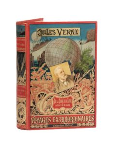 De la Terre à la Lune et Autour de la Lune par Jules Verne. Illustrations par de Montaut (De la Terre à la Lune) et Émile Bayard et A. de Neuville (Autour de la Lune). Paris, Bibliothèque d'Éducation et de Récréation, J. Hetzel et Cie, sd (1894). Grand in-8° double. Cartonnage éditeur polychrome «au portrait collé». A. Lenègre et Cie Relieur. Tranches dorées. Gardes bleu. Trois planches hors-texte en couleurs pour Autour de la Lune. Catalogue «HF» pour 1894-1895. Imprimerie Gauthier-Villars. Quelques rousseurs. Le 1er H-T d'Autour de la Lune (sur 4) est absent (d'origine ? mais aisément ajoutable). Sinon, magnifique exemplaire bien pincé, au dos et à la plaque éclatante. Titre rare dans ce cartonnage, surtout dans une condition aussi exceptionnelle.