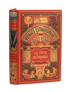 Le Pays des Fourrures par Jules Verne. Illustrations de Férat et de Beaurepaire. Paris, Collection Hetzel, sd (ca 1908). Grand in-8° double. Cartonnage polychrome «à un éléphant titre dans le cartouche». Engel relieur. Tranches dorées. Gardes bleu-gris. Six planches hors-texte en couleurs. Imprimerie Belin. Gardes parfaitement renouvelées. Déchirures sans manques aux pp. 33-40. Sinon bel exemplaire de ce titre rare en cartonnage polychrome «dos au phare».