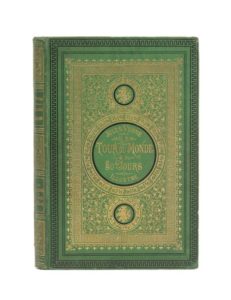 Le Tour du Monde en 80 jours par Jules Verne. Illustrations par de Neuville et L. Benett. Paris, Bibliothèque d'Éducation et de Récréation, J. Hetzel et Cie, sd (1874). Grand in-8° simple. Cartonnage éditeur en pleine percaline vert prairie «aux bouquets de roses» du 5e type. Charles Magnier Relieur. Tranches dorées. Gardes bleu. Imprimerie Gauthier-Villars. Édition originale illustrée et premier cartonnage simple. Coiffes frottées. Coins inférieurs restaurés. Quelques rousseurs. Sinon, bel exemplaire dans une percaline verte très rarement utilisée par Hetzel, et surtout éblouissante !