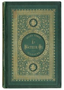 Le Docteur Ox par Jules Verne. Illustrations de Bertrand, Froelich, Th. Schuler, Bayard et Marie. Paris, Bibliothèque d'Éducation et de Récréation, J. Hetzel et Cie, sd (1874). Grand in-8° simple. Cartonnage éditeur en pleine percaline vert gazon et «aux bouquets de roses» du 5e type. Gardes vert clair. Charles Magnier relieur. Catalogue d'une page en fin de volume. Imprimerie Gauthier-Villars. Première édition illustrée et premier cartonnage simple. Très bel exemplaire.