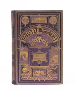 L'Île Mystérieuse par Jules Verne. Illustrations de Férat. Paris, Bibliothèque d'Éducation et de Récréation, J. Hetzel et Cie, sd (1875). Grand in-8° triple. Cartonnage éditeur en pleine percaline violette «aux deux éléphants» Engel et au cartouche en négatif. Engel & Fils relieurs. Tranches dorées. Gardes marron. Catalogue sans mention pour 1875-1876. Imprimerie Gauthier-Villars. Édition originale illustrée et premier cartonnage simultané avec le cartonnage d'essai personnalisé. Dos (mal) reteinté. 1re garde fendue. Petite salissure en tête de la charnière de la seconde. Sinon, les deux plats sont superbes et les cahiers intérieurs sans rousseurs. De toute rareté, quoi qu'il en soit.