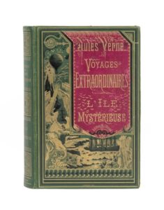 L'Île Mystérieuse par Jules Verne. Illustrations de Férat. Paris, Bibliothèque d'Éducation et de Récréation, J. Hetzel et Cie, sd (ca 1875). Grand in-8° triple. Cartonnage éditeur bicolore «à la bannière» pourpre sur fond vert gazon. Mention «Collection» dans la bannière. Lenègre relieur. Tranches dorées. Gardes bleu. Imprimerie Gauthier-Villars. Édition originale illustrée et second cartonnage simultané avec le cartonnage «aux deux éléphants» Engel et au cartouche en positif. Coiffes habilement renforcées. Petit manque de papier en haut de la charnière de la 1re garde. Sinon, bel exemplaire dans une rare et superbe alliance de couleurs.