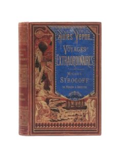 Michel Strogoff, de Moscou à Irkoutsk par Jules Verne. Illustrations de Férat. Paris, Bibliothèque d'Éducation et de Récréation, J. Hetzel et Cie, sd (1876). Grand in-8° double. Cartonnage éditeur bicolore «à la bannière» bleu sur fond rouge cerise. Lenègre Relieur. Tranches dorées. Gardes bleu. Imprimerie Gauthier-Villars. Édition originale illustrée et premier cartonnage concomitant avec celui «aux deux éléphants» de type Engel et Fils. Coiffes frottées. Petites décolorations au second plat. Quelques feuillets déréglés. Rousseurs par endroits. Ce volume n'en est pas moins un bel exemplaire bien pincé et de très bonne tenue.