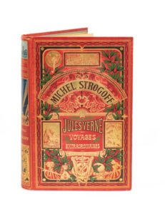Michel Strogoff, de Moscou à Irkoutsk par Jules Verne. Illustrations de Férat. Paris, Bibliothèque d'Éducation et de Récréation, J. Hetzel et Cie, sd (ca 1908). Grand in-8° double. Cartonnage éditeur en pleine percaline polychrome «à un éléphant et au titre dans l'éventail». Tranches dorées. Gardes bleu. Six planches hors-texte en couleurs. Imprimerie Belin. Discrètes décolorations sur le 1er mors et la coupe en pied du 1er plat. Seconde garde fendue. Sinon, bel exemplaire de bonne tenue.