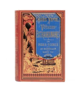 Les Indes-Noires / Le Chancellor / Martin Paz par Jules Verne.. Illustrations de Férat (Les Indes-Noires et Martin Paz) et Riou (Le Chancellor). Paris, Bibliothèque d'Éducation et de Récréation, J. Hetzel et Cie, sd (1877). Grand in-8° double. Cartonnage éditeur bicolore «à la bannière» bleu sur fond rouge framboise avec 2e plat Lenègre de type «b». Lenègre Relieur. Tranches dorées. Gardes bleu. Catalogue «J» pour 1877-1878. Imprimerie Gauthier-Villars. Éditions originales illustrées et premier cartonnage double concomitant avec les versions «à la grenade» et «aux fleurs de lys». Très bel exemplaire.