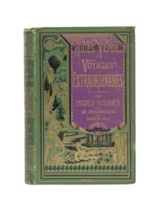 Les Indes-Noires / Le Chancellor / Martin Paz par Jules Verne.. Illustrations de Férat (Les Indes-Noires et Martin Paz) et Riou (Le Chancellor). Paris, Bibliothèque d'Éducation et de Récréation, J. Hetzel et Cie, sd (ca 1878). Grand in-8° double. Cartonnage éditeur bicolore «à la bannière» violine sur fond vert gazon avec 2e plat Lenègre de type «b». Lenègre Relieur. Tranches dorées. Gardes bleu. Imprimerie Gauthier-Villars. Il s'agit ici du 2e tirage pour les deux titres, sur papier fin, dans l'ultime cartonnage «à la bannière». Il est plus haut que son prédécesseur d'environ 1 cm. Dos, coiffes, coupes et coins frottés. Petite décoloration sur la coupe extérieure du 1er plat.... Sinon, bel exemplaire de cette très rare édition «à la bannière». Belle alliance !