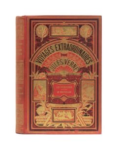 Les Indes-Noires / [Mers et océans] Le Chancellor / [Pérou] Martin Paz par Jules Verne. Illustrations de Férat (Les Indes-Noires et Martin Paz) et Riou (Le Chancellor). Paris, Bibliothèque d'Éducation et de Récréation, J. Hetzel et Cie, sd (1885). Grand in-8° double. Cartonnage éditeur en pleine percaline rouge «aux deux éléphants» du 3e type Lenègre. Lenègre Relieur. Tranches dorées. Gardes bleu. Catalogue «CR» pour 1885-1886. Imprimerie Gauthier-Villars. Dos légèrement passé. Décoloration le long des coupes en pied de chaque plat. Sinon, bel exemplaire d'excellente tenue de ce titre rare «aux deux éléphants».
