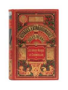 Les Indes-Noires / Le Chancellor / Martin Paz par Jules Verne. Illustrations de Férat (Les Indes-Noires et Martin Paz) et Riou (Le Chancellor). Paris, Bibliothèque d'Éducation et de Récréation, J. Hetzel et Cie, sd (ca 1905). Grand in-8° double. Cartonnage éditeur polychrome «à un éléphant titre dans le cartouche». Engel Relieur. Tranches dorées. Gardes bleu. Six planches hors-texte en couleurs. Imprimerie Belin. Coiffes consolidées. Sinon, bel exemplaire de ce titre particulièrement rare !