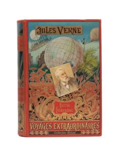 Hector Servadac par Jules Verne. Illustrations de P. Philippoteaux. Paris, Bibliothèque d'Éducation et de Récréation, J. Hetzel et Cie, sd (1892). Grand in-8° double. Cartonnage éditeur polychrome «au portrait collé». Lenègre relieur. Gardes bleu. Tranches dorées. Catalogue «GU» pour 1893-1894. Imprimerie Gauthier-Villars. Édition originale illustrée. Rousseurs en fin d'ouvrage. Sinon, bel exemplaire avec un cartonnage frais et une gouttière remarquable. Titre rare dans cette condition.