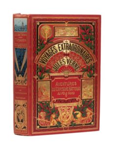 Voyages et Aventures du capitaine Hatteras par Jules Verne. Illustrations de Riou. Paris, Collection Hetzel, sd (ca 1910). Grand in-8° double. Cartonnage éditeur polychrome «à un éléphant titre dans le cartouche». Percaline rouge foncé. Tranches dorées. Gardes bleu. Six hors-textes couleurs. Imprimerie Belin. Très bel exemplaire ! Soulignons la qualité inédite des hors-textes en couleurs, tirés ici - il s'agit de l'ultime retirage Hetzel du roman - en plusieurs couleurs très vives (elles étaient auparavant tirées en une teinte, généralement bleu ou bistre).