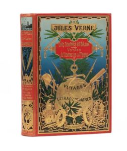 Cinq semaines en ballon / [Allemagne/Islande] Voyage au centre de la Terre par Jules Verne. Illustrations de Riou et Montaut puis Riou seul. Paris, Collection Hetzel, sd (ca 1903). Grand in-8° double. Cartonnage éditeur polychrome «au globe doré» du 4e type. Engel relieur. Tranches dorées. Gardes bleu. Huit planches hors-texte en couleurs. Imprimerie Gauthier-Villars. Exemplaire dans un état proche de l'état de neuf. Une merveille et un titre loin d'être si commun en cartonnage «au globe doré» !