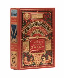 Les Enfants du capitaine Grant par Jules Verne. Illustrations de Riou. Paris, Collection Hetzel, sd (ca 1916). Grand in-8° triple. Cartonnage éditeur polychrome Hetzel-Hachette «à un éléphant titre dans le cartouche». Caractères «nouille» dans le cartouche. Dos au phare. Intérieur Hetzel. Tranches dorées. Gardes bleu. Imprimerie Gauthier-Villars. Bel exemplaire ! La seule version «dos au phare» pour ce titre.