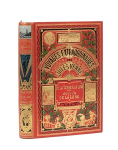 De la Terre à la Lune / Autour de la Lune par Jules Verne. Illustrations par de Montaut (De la Terre à la Lune) et Émile Bayard et A. de Neuville (Autour de la Lune). Paris, Collection Hetzel, sd (ca 1908). Grand in-8° double. Cartonnage éditeur polychrome «à un éléphant titre dans le cartouche». Engel relieur. Tranches dorées. Gardes bleu. Six hors-textes en couleurs. Imprimerie Belin. Magnifique exemplaire bien pincé. Les ors sont éclatants ! Titre rare.