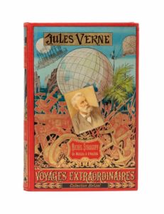 Michel Strogoff, de Moscou à Irkoutsk par Jules Verne. Illustrations de Férat. Paris, Bibliothèque d'Éducation et de Récréation, J. Hetzel et Cie, sd (1892). Grand in-8° double. Cartonnage éditeur polychrome «au portrait collé». Lenègre relieur. Tranches dorées. Gardes bleu. Catalogue «FX» pour 1891-1892. Imprimerie Gauthier-Villars. Coiffes très habilement restaurées. Sinon, cartonnage et intérieur absolument superbes.