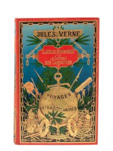 Claudius Bombarnac / [Europe] Le Château des Carpathes par Jules Verne. Illustrations de Benett. Paris, Bibliothèque d'Éducation et de Récréation, J. Hetzel et Cie, sd (ca 1900). Grand in-8° double. Cartonnage éditeur polychrome «au globe doré» du 3e type. Engel Relieur. Tranches dorées. Gardes bleu. Douze planches hors-texte en couleurs. Imprimerie Gauthier-Villars. Les cahiers intérieurs sont en premier tirage. Dos très légèrement insolé. Sinon, très bel exemplaire ! Titre rare «au globe doré» !
