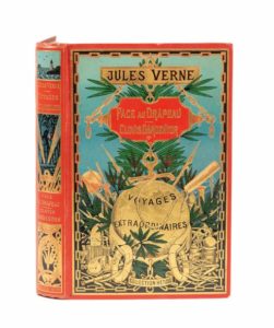 Face au Drapeau / [Afrique] Clovis Dardentor par Jules Verne. Illustrations de L. Benett. Paris, Bibliothèque d'Éducation et de Récréation, J. Hetzel Éditeur, sd (1897). Grand in-8° double. Cartonnage éditeur polychrome «au globe doré» du 2e type (à l'empiècement). Engel Relieur. Tranches dorées. Gardes anthracite. Douze planches hors-texte en couleurs. Catalogue «O» pour 1896-1897. Imprimerie Gauthier-Villars. Premières éditions illustrées et deuxième cartonnage double. Minuscule manque dans le bleu de la grotte au dos. Sinon, magnifique exemplaire !