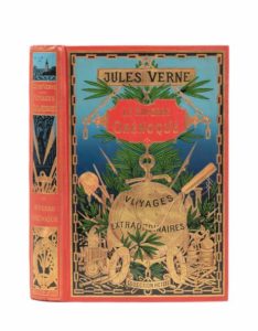 Le Superbe Orénoque par Jules Verne. Illustrations de Georges Roux. Paris, Bibliothèque d'Éducation et de Récréation, J. Hetzel Éditeur, sd (1898). Grand in-8° double. Cartonnage éditeur polychrome «au globe doré» du 3e type. Engel Relieur. Tranches dorées. Gardes bleu. Vingt planches hors-texte en couleurs ou tirées en sépia ou gris-bleu. Catalogue «AJ» pour 1898-1899. Imprimerie Gauthier-Villars. Édition originale illustrée et premier cartonnage. Superbe exemplaire !