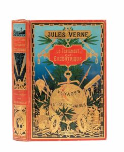 Le Testament d'un excentrique par Jules Verne. Illustrations de Georges Roux. Paris, Bibliothèque d'Éducation et de Récréation, J. Hetzel Éditeur, sd (1898). Grand in-8° double. Cartonnage éditeur polychrome «au globe doré» du 3e type. Engel Relieur. Tranches dorées. Gardes bleu-gris. Vingt planches hors-texte en couleurs ou tirées en sépia ou gris dont trois reproductions photographiques + une planche rempliée «Le Noble jeu [de l'oie] des États-Unis d'Amérique» + une carte dépliante hors-texte des États-Unis d'Amérique. Catalogue «AV» pour 1899-1900. Imprimerie Gauthier-Villars. Édition originale illustrée et premier cartonnage. Minuscule petite tache dans le cartouche du titre au 1er plat. Sinon, bel exemplaire.