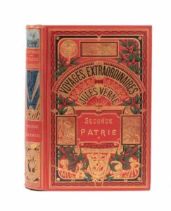 Seconde Patrie par Jules Verne. Illustrations de Georges Roux et Yan' Dargent (non crédité en page de titre). Paris, Collection Hetzel, sd (ca 1910 pour les cahiers intérieurs et ca 1916 pour le cartonnage). Grand in-8° double. Cartonnage éditeur polychrome Hetzel-Hachette «à un éléphant titre dans le cartouche». Intérieur Hetzel. Sans mention de relieur. Tranches dorées. Gardes bleu. Les planches hors-texte sont maintenant in-texte et titrées en noir. Imprimerie Gauthier -Villars. Bel exemplaire. Peu commun sous cette forme.