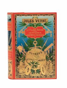 Le Village aérien / [Mers et océans] Les Histoires de Jean-Marie Cabidoulin par Jules Verne. Illustrations de George Roux. Paris, Collection Hetzel, sd (1903) Grand in-8° double. Cartonnage éditeur polychrome «au globe doré» du 3e type. Engel et Fils relieurs. Tranches dorées. Gardes bleu. Douze planches hors-texte en couleurs. Imprimerie Gauthier-Villars. Éditions originales illustrées et premier cartonnage double. Magnifique exemplaire !