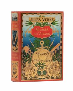 Bourses de Voyage par Jules Verne. Illustrations de L. Benett. Paris, Bibliothèque d'Éducation et de Récréation, J. Hetzel Éditeur, sd (1904). Grand in-8° double. Cartonnage éditeur polychrome «au globe doré» du 4e type. Engel Relieur. Tranches dorées. Gardes anthracite. Douze planches hors-texte en couleurs. Imprimerie Gauthier-Villars. Édition originale illustrée et cartonnage de la seconde émission (de type Engel «i»). Bel exemplaire.