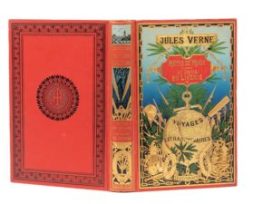 Maître du Monde / Un drame en Livonie par Jules Verne. Illustrations de Georges Roux (Maître du Monde) et L. Benett (Un drame en Livonie). Paris, Collection Hetzel, sd (1904). Grand in-8° double. Cartonnage éditeur polychrome «au globe doré» du 4e type. Engel Relieur. Douze planches hors-texte en couleurs. Tranches dorées. Gardes bleu-foncé. Imprimerie Gauthier-Villars. Éditions originales illustrées et premier cartonnage double. Très bel exemplaire aux ors éclatants !