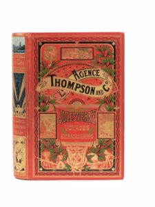 L'Agence Thompson and Cie par Jules Verne. Illustrations de L. Benett. Paris, Collection Hetzel, 1907. Grand in-8° double. Cartonnage éditeur polychrome «au titre dans l'éventail». Engel Rel. Tranches dorées. Gardes bleu. Douze gravures grises ou polychromes hors-texte. Imprimerie Gauthier-Villars. Édition originale illustrée et premier cartonnage. Ors frottés autour du «L» de L'Agence Thompson anc C°. Sinon, bel exemplaire.
