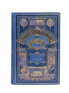 Les Tribulations d'un Chinois en Chine / Les Cinq cents millions de la Begum par Jules Verne. Illustrations de Benett. Paris, Bibliothèque d'Éducation et de Récréation, J. Hetzel et Cie, sd (1879). Grand in-8° double. Cartonnage éditeur en pleine percaline bleu azur «aux deux éléphants» avec 2e plat Lenègre de type «e». Lenègre Relieur. Tranches dorées. Gardes bleu. Catalogue «AB» pour 1879-1880. Imprimerie Gauthier-Villars. Éditions originales illustrées et premier cartonnage double. Petit accroc en pied du second mors. Un détail lorsqu'on tient l'exemplaire en main : c'est indiscutablement une merveille, par sa couleur comme par ses ors !