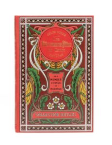 Les Tribulations d'un Chinois en Chine par Jules Verne. Illustrations de Benett. Paris, Collection Hetzel, sd (ca 1905). Grand in-8° simple. Cartonnage éditeur polychrome «aux feuilles d'acanthes et à la pastille rouge». Ch. Magnier et ses Fils relieurs. Tranches dorées. Gardes bleu. Trois planches hors-texte en couleurs. Imprimerie Belin. Exemplaire proche de l'état de neuf ! Les hors-textes sont en quatre couleurs !