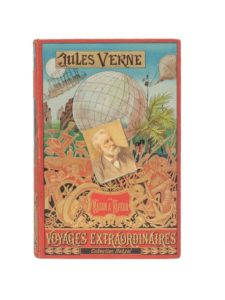 La Maison à Vapeur par Jules Verne. Illustrations par Benett. Paris, Bibliothèque d'Éducation et de Récréation, J. Hetzel et Cie, sd (ca 1893). Grand in-8° double. Cartonnage éditeur polychrome «au portrait collé». Lenègre relieur. Tranches dorées. Gardes bleu. Catalogue «GU» pour 1893-1894. Imprimerie Gauthier-Villars. Bel exemplaire de ce titre rare en cartonnage polychrome.