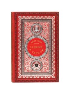 La Maison à Vapeur par Jules Verne. Illustrations de Benett. Paris, Bibliothèque d'Éducation et de Récréation, J. Hetzel et Cie, sd (1898). Deux volumes grands in-8° simples. Cartonnages éditeur en pleine percaline rouge (seule couleur) «aux initiales, argentée». Magnier et ses fils relieurs. Tranches dorées. Gardes bleu-gris. Six planches hors-texte en une couleur. Catalogue «HF» pour 1894-1895 en fin du second volume. Imprimerie Gauthier-Villars. Édition originale illustrée. Petite trace grise dans le bas du dos du tome 2. Sinon, très bel exemplaire.