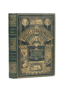 La Jangada / 800 lieues sur l'Amazone par Jules Verne. Illustrations de Benett. Paris, Bibliothèque d'Éducation et de Récréation, J. Hetzel Éditeur, sd (1881). Grand in-8° double. Cartonnage éditeur en pleine percaline vert de vessie «aux deux éléphants» du 2e type Lenègre. Tranches dorées. Gardes bleu. Catalogue «AP» pour 1881- 1882. Imprimerie Gauthier-Villars. Édition originale illustrée (seconde émission du premier tirage contenant l'errata) et premier cartonnage. Bel exemplaire !
